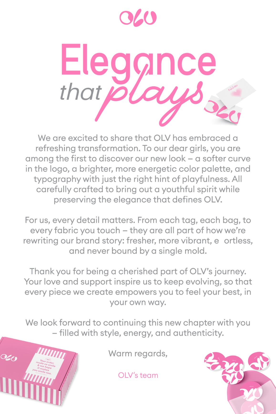 Mỗi thay đổi của OLV bắt đầu từ những chi tiết nhỏ: một đường cong logo mềm mại hơn, bảng màu tươi tắn hơn, kiểu chữ tinh nghịch hơn. Từng chiếc tag, từng chiếc túi, từng chất liệu bạn chạm vào đều góp phần tạo nên diện mạo thương hiệu mới: trẻ trung, đầy năng lượng nhưng vẫn tinh tế.